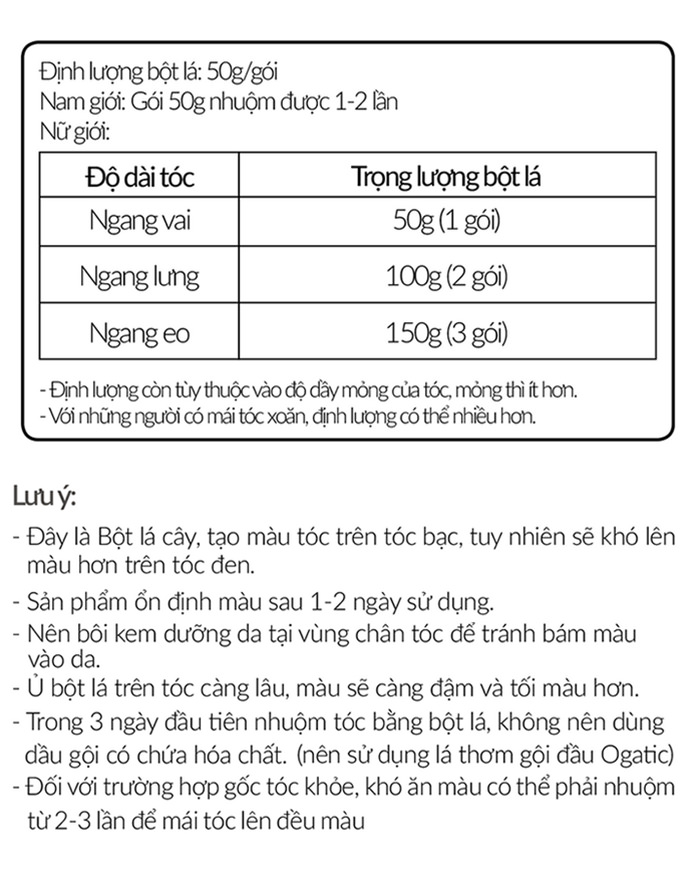 Sản phẩm bột lá nhuộm tóc dùng để phủ bạc mái tóc rất tốt. Khi nhuộm bằng bột lá móng sẽ cho ra mái tóc màu nâu đỏ, khi nhuộm bằng bột lá chàm cho mái tóc màu xanh đen (màu chàm). Khách hàng có thể lựa chọn sản phẩm đã mix sẵn giữa bột lá móng và bột lá chàm để cho ra mái tóc có Màu Nâu hoặc Màu Đen